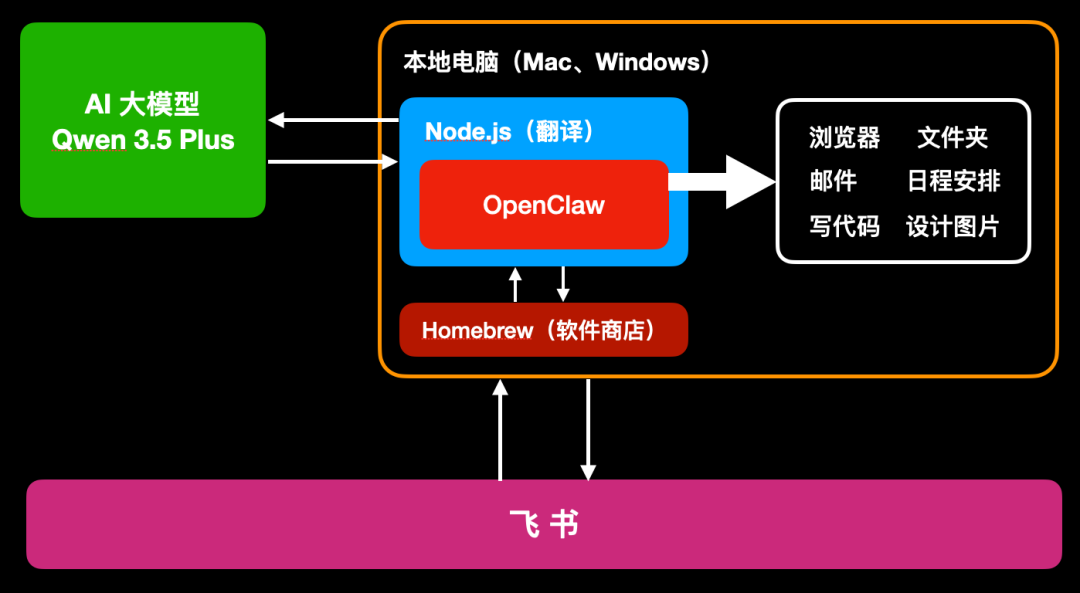 Node.js 是一个运行环境,它是 OpenClaw 和电脑之间的翻译。Homebrew 是一个综合软件商店,是用来安装和管理 Node.js 的。